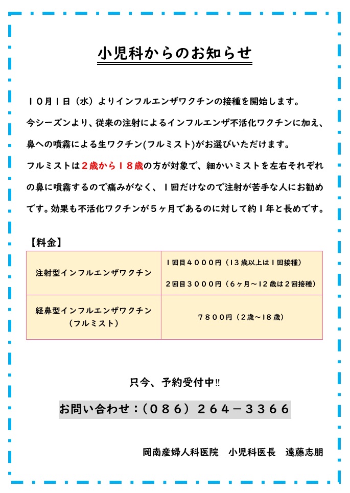 10月1日(水)より、小児科でインフルエンザワクチン接種を開始します。