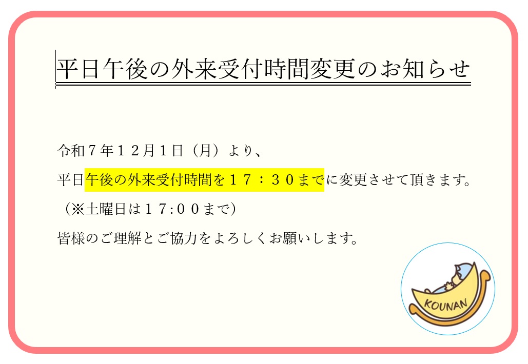 - 12月1日(月)より平日午後の外来窓口受付終了時間変更のお知らせ